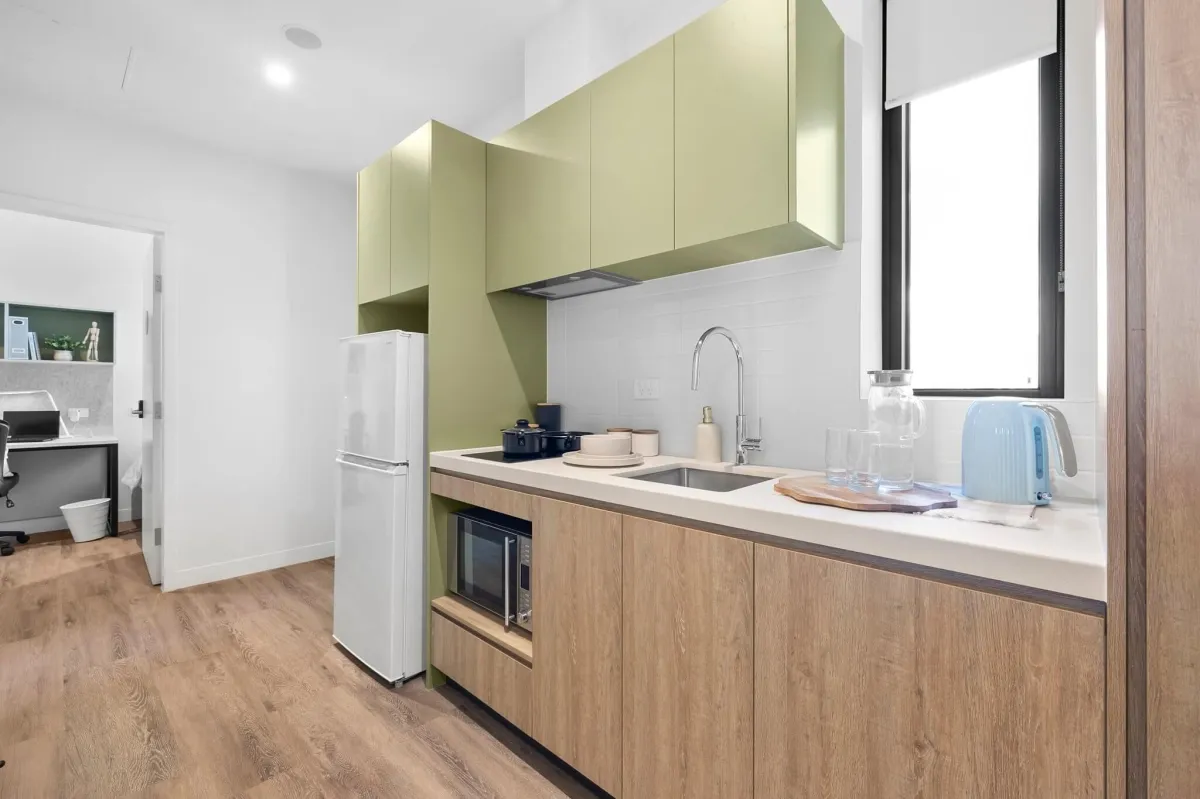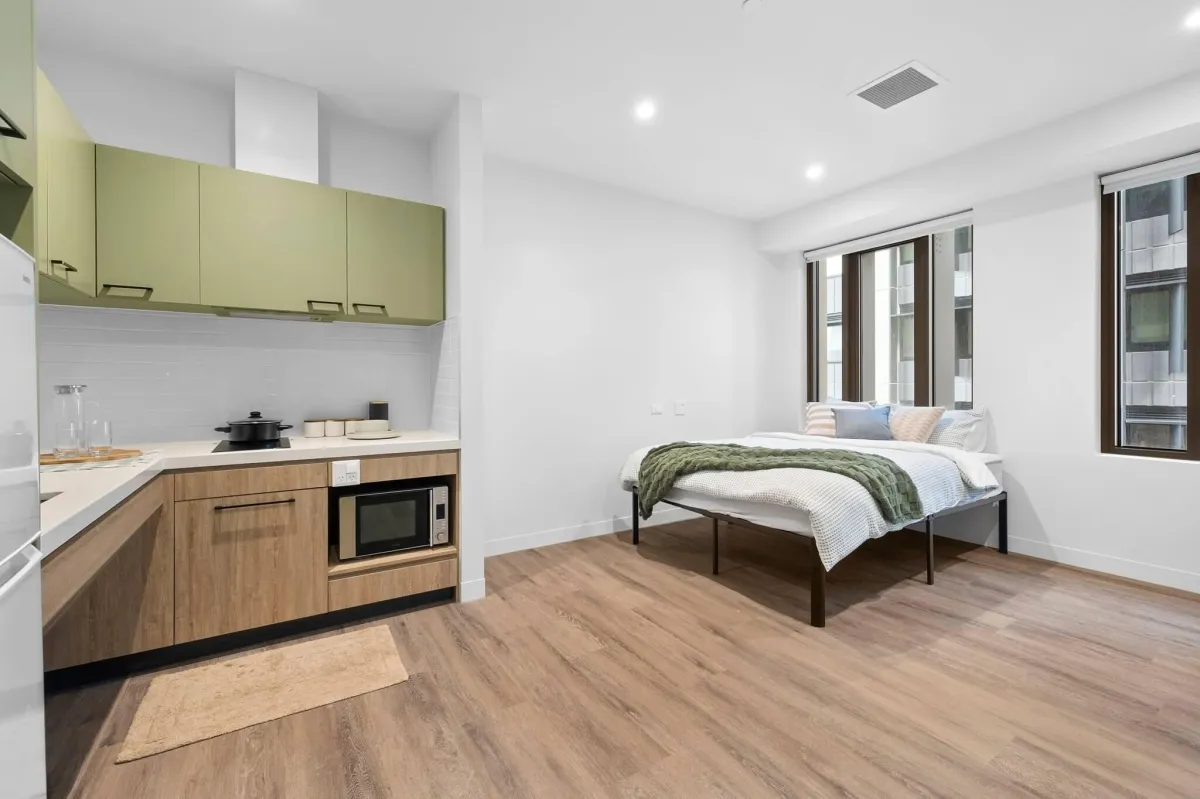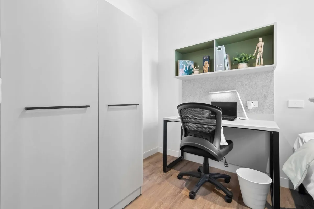 Private studios with a King Single bed, private bathroom, kitchenette, storage area and your own study area.